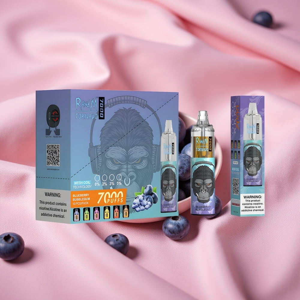RandM Fumot Tornado 7000 Puffs 14ml 850mAh Mesh Coil Typ-C RGB Luftregelung Heidelbeer-Kaugummi